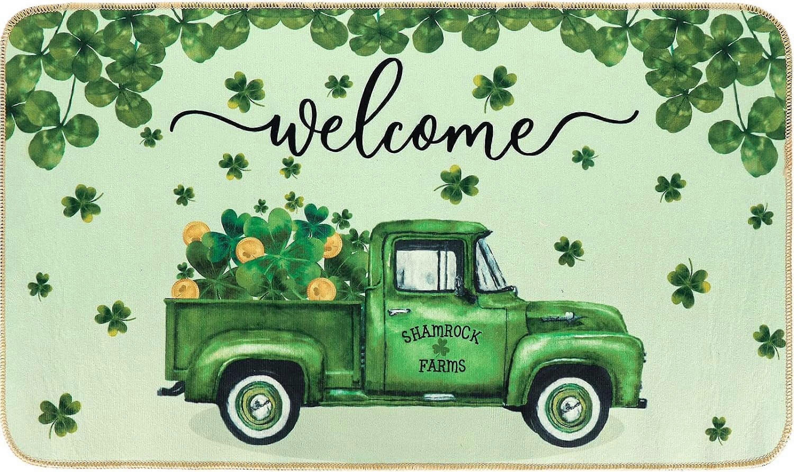 St. Patrick's Day Welcome Door Mat, Watercolor Green Shamrock Clover Truck Design, Anti-Slip Rubber Back, Irish Felt Doormat for Indoor Outdoor, 17 x