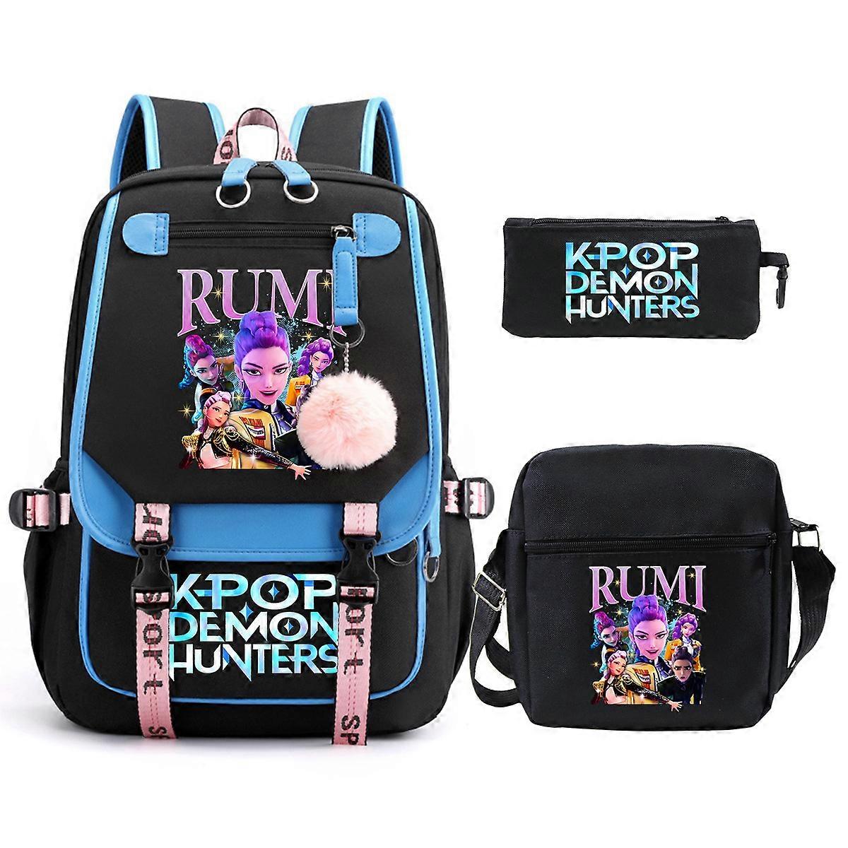 Demon Hunter Girls Student School Bag Shoulder Bag Casual Pencil Case Black and blue 1 Three-piece set