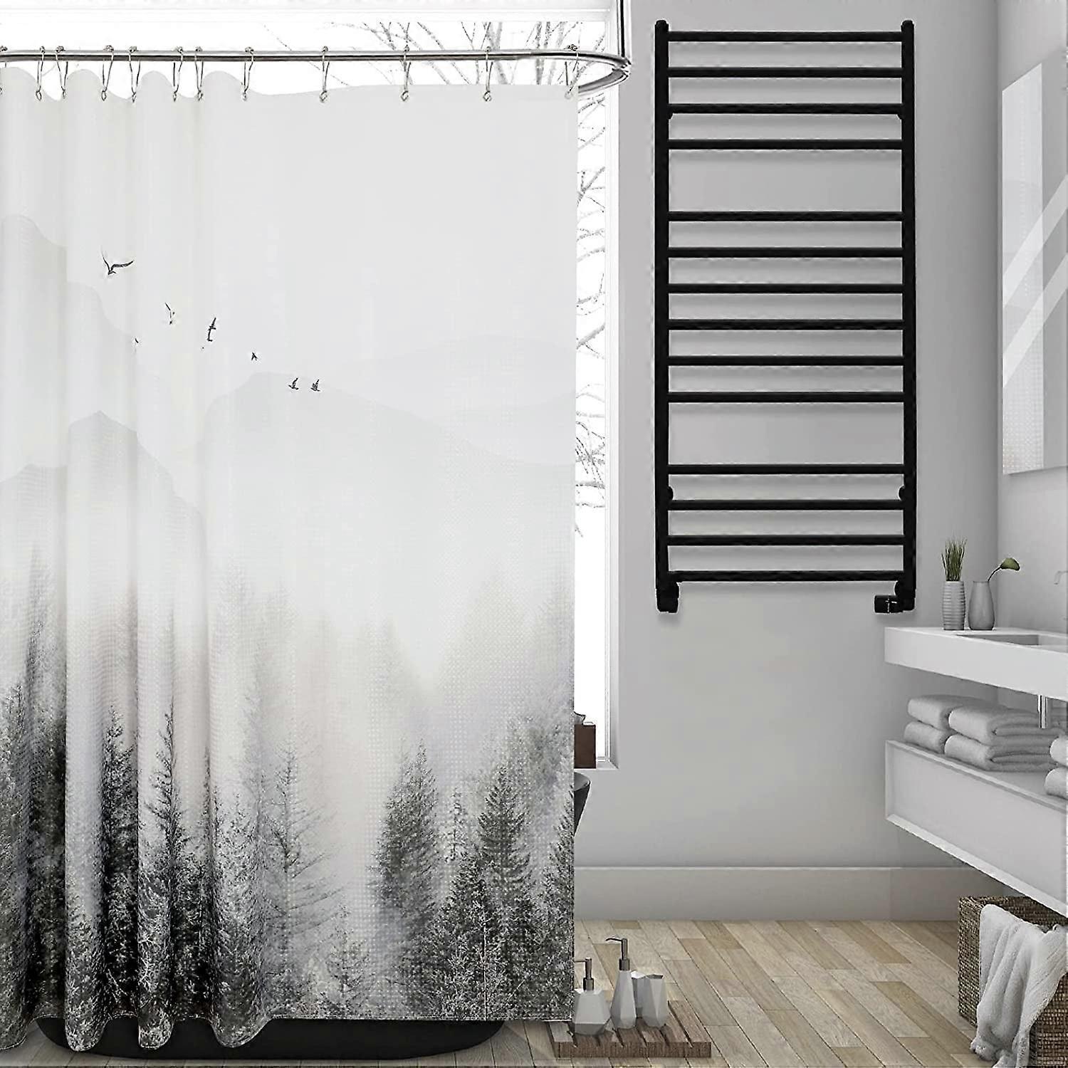 White Snowy Forest Shower Curtain 72x78 inch, Watercolor Mountain Winter Art, Water Repellent Fabric Set with 12 Hooks
