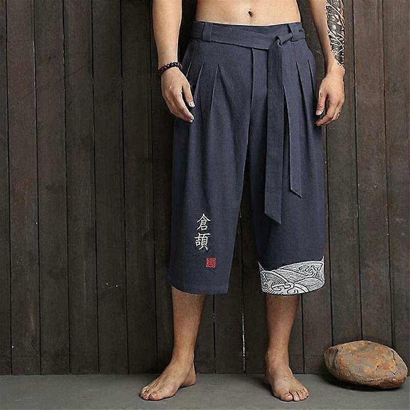 Men 3/4 Long Shorts Cotton Linen Below Knee Pants Lace-Up Kung Fu Tai Chi White