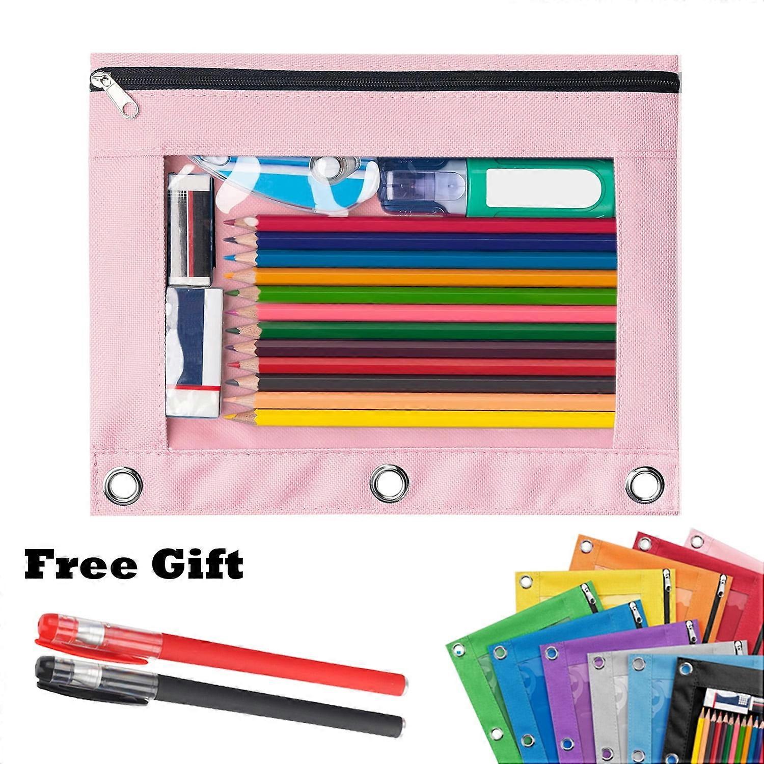 Lksixu Pencil Pouch for 3 Ring Binder, Clear Window, Smooth Zipper, Large Oxford Bag with 3 Reinforced Grommets, Pink