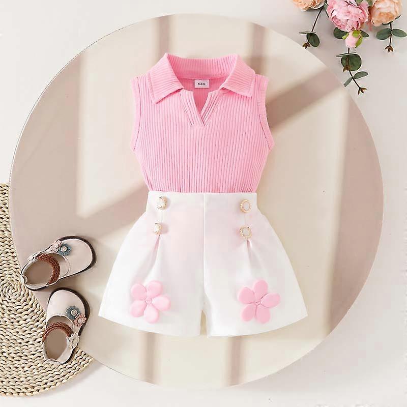 Baby Costume 2Pcs Sets Toddler Girls Clothes Pink Sleeveless Lapel Pit Stripe Tops Applique Button Shorts Summer Infant Outfits