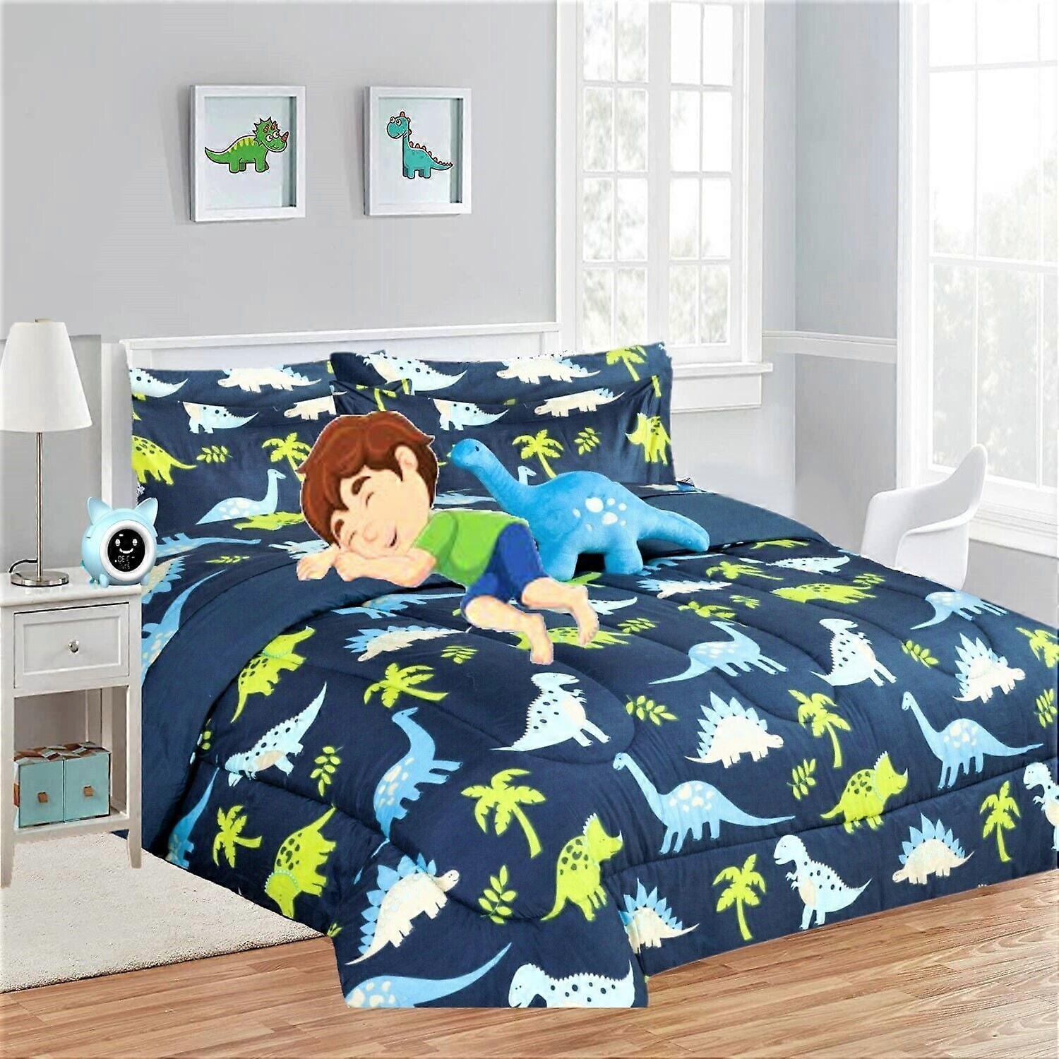 Kids girls boys comforter set bed in bag dinosaur blue printed easy wash twin size 6 pieces super soft bedding décor