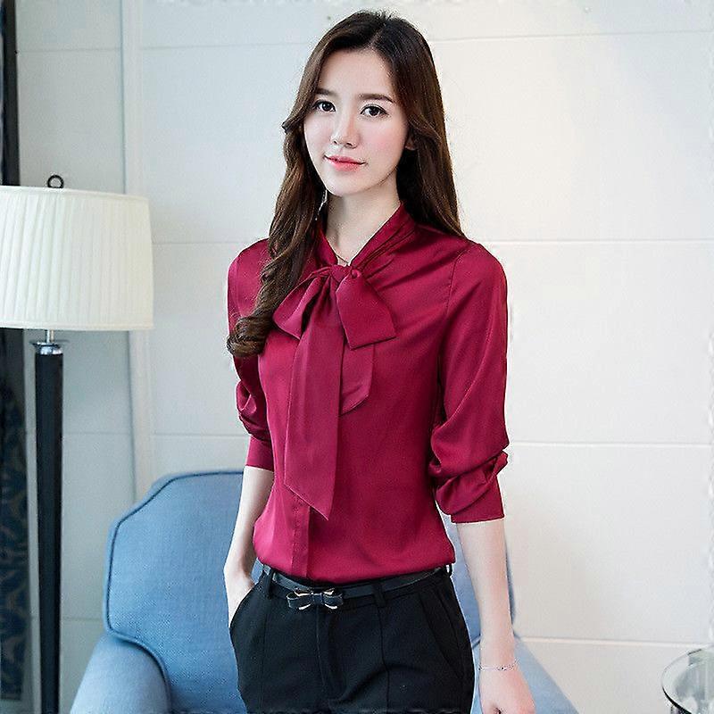 Lady Satin Faux Silk Shirts Tops Long Sleeve Bow Ribbon Blouse Retro Casual Cute