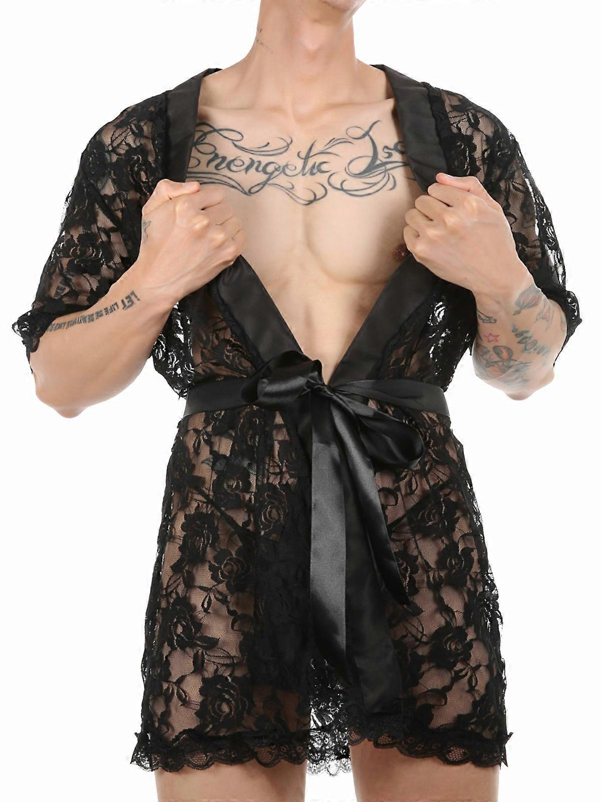 Men Lace Night-Robe See-through Kimono Bathrobe Sleepwear Crossdress Lingerie