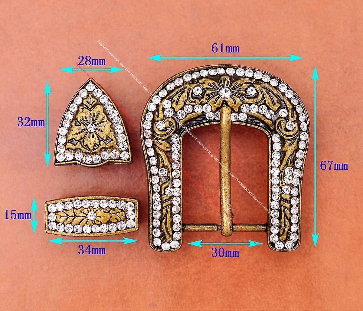 30mm Brass Western Cowboy Rodeo Black Rhinestone 3PCS Set Belt Buckle End Keeper