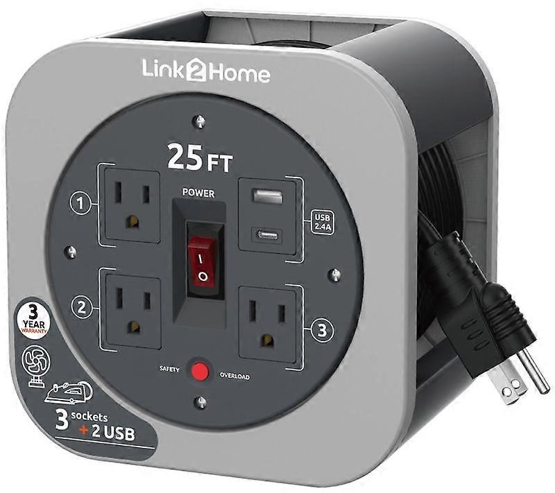 Link2Home Cord Reel 25' Extension Cord Power Outlet & USB