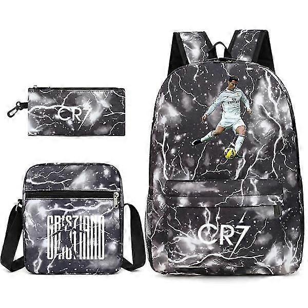 C Ronaldo CR7 Printed Backpack, 3-Piece Student Set, Black Thunder Lightning Design, Compatible with School & Travel