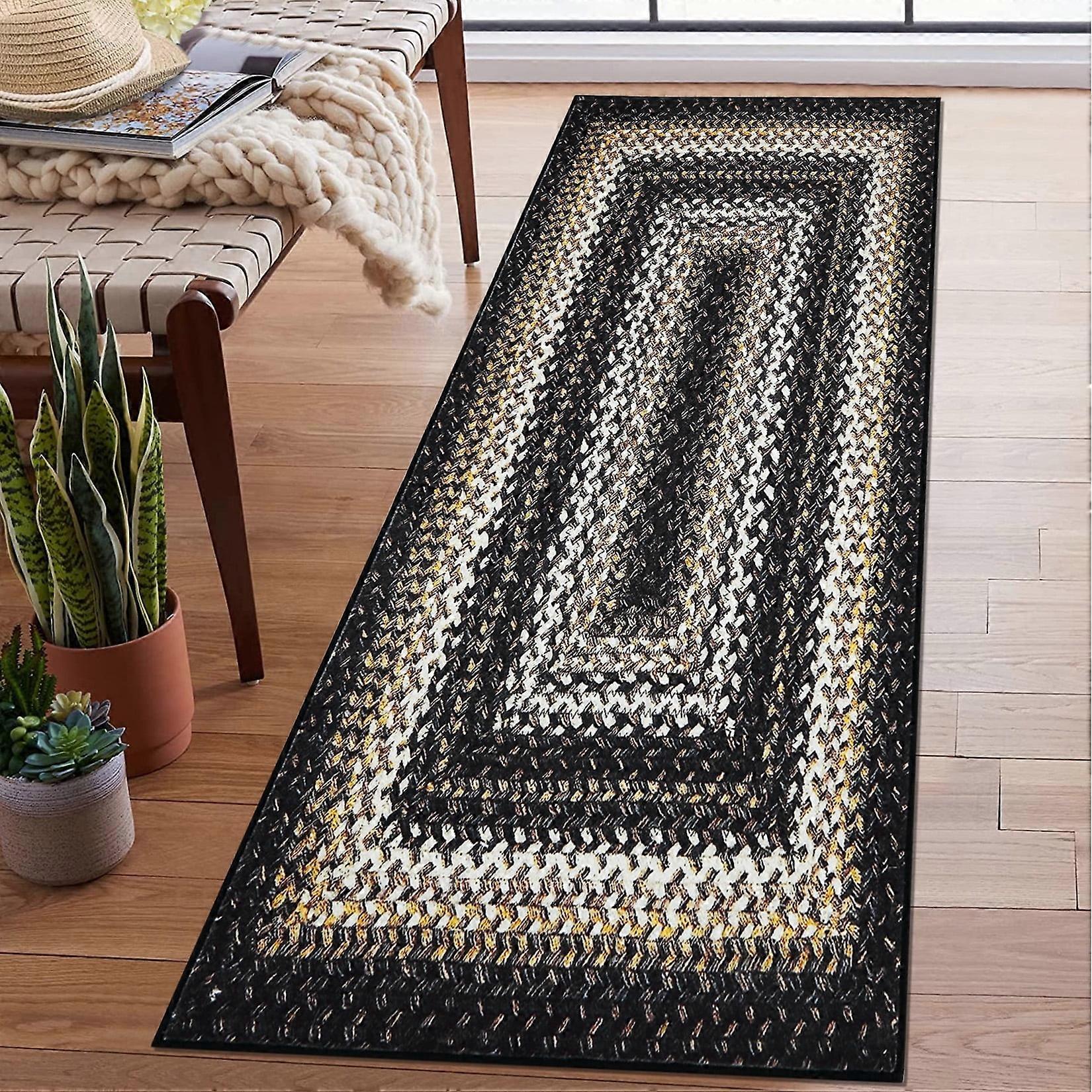 Garvee Braided Printed Runner Rug 2'x8' Washable Boho Runner Rug Modern Rustic Geometric Rug Runner for Laundry Kitchen, Black
