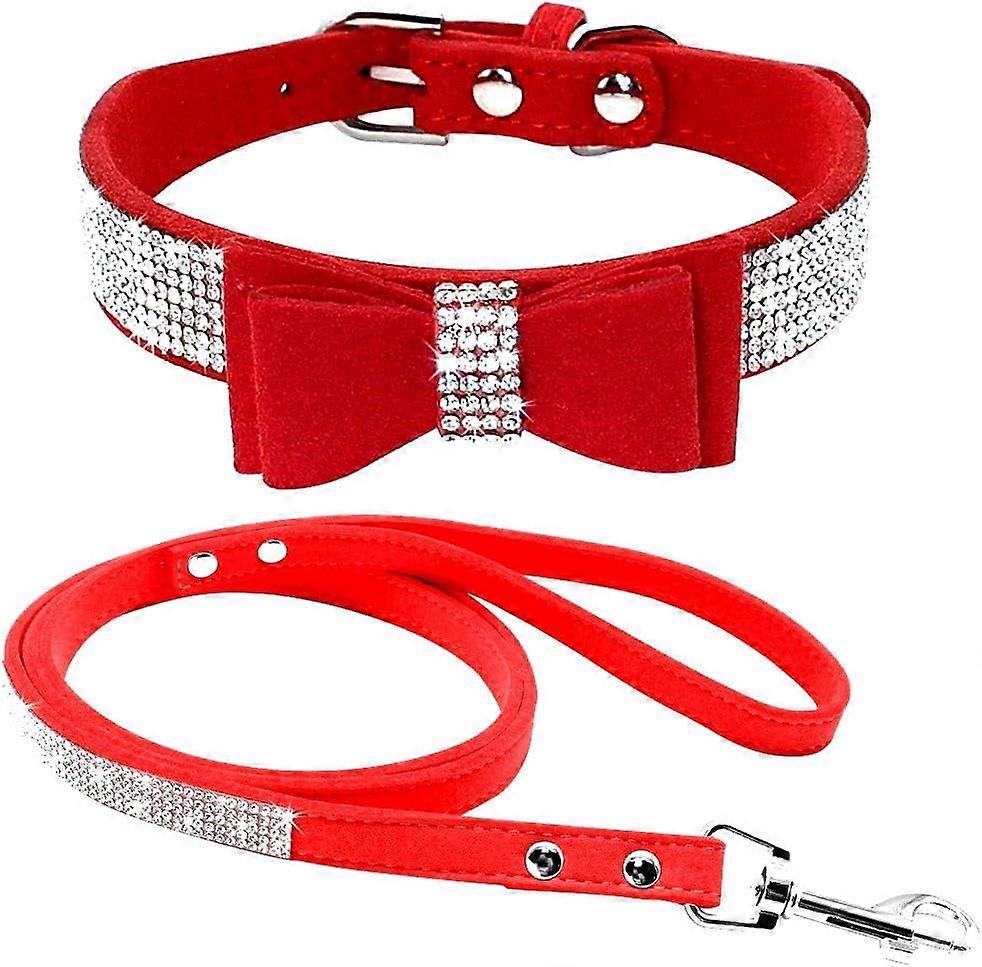Derest Pet Dog Cat Collar, Soft Suede Leather Bling Rhinestone Crystal Collar with Dog Leash Combo Set