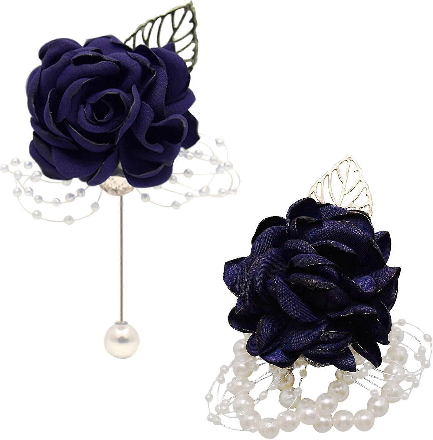Rose Wrist Corsage & Boutonniere Set 2pcs, Pearl Wrist Flower Blue & Groom Boutonniere, Wedding Bridal Hand Flower for Prom, Party, Homecoming