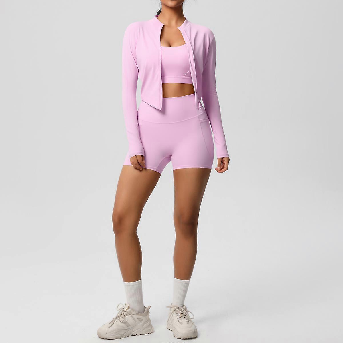 3 Pieces Solid Color Yoga Coat Bra Pockets Shorts Set Slim Running Zipper Jacket Gym Workout Top Push Up Fitness Shorts Yoga Set