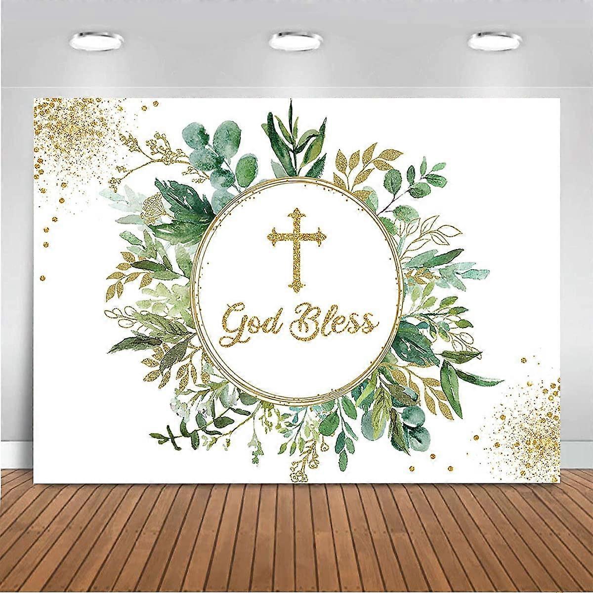 God Bless Baptism Backdrop, Green Leaves, First Holy Communion & Christening Party Decor for Boys Girls, Baby Shower Banner Background