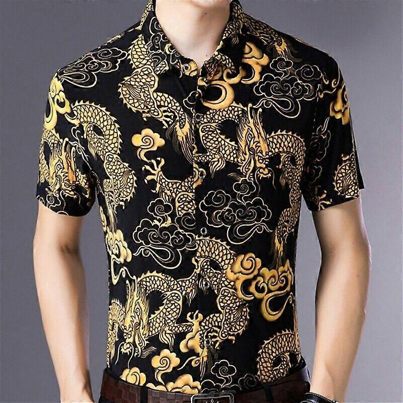 Mens Shirts Print Gold Dragon Short Sleeve Button Down Tops Slim Casual Tee