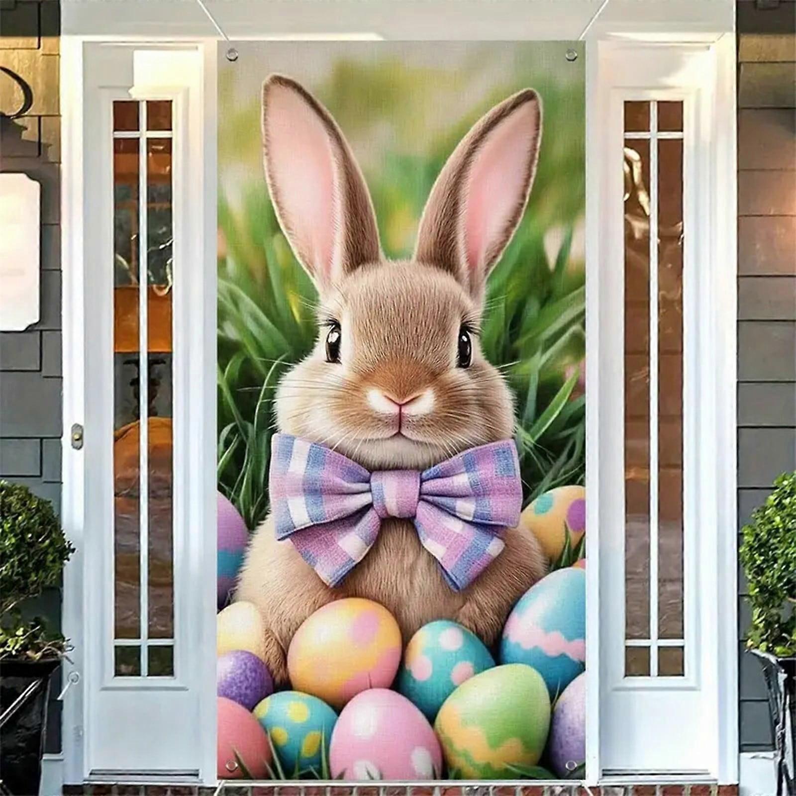 YMARPT Happy Easter Door Cover, Fabric Easter Bunny Door Cover compatible with Easter Decor, Cute Bunny Carrot Photography Backdrop