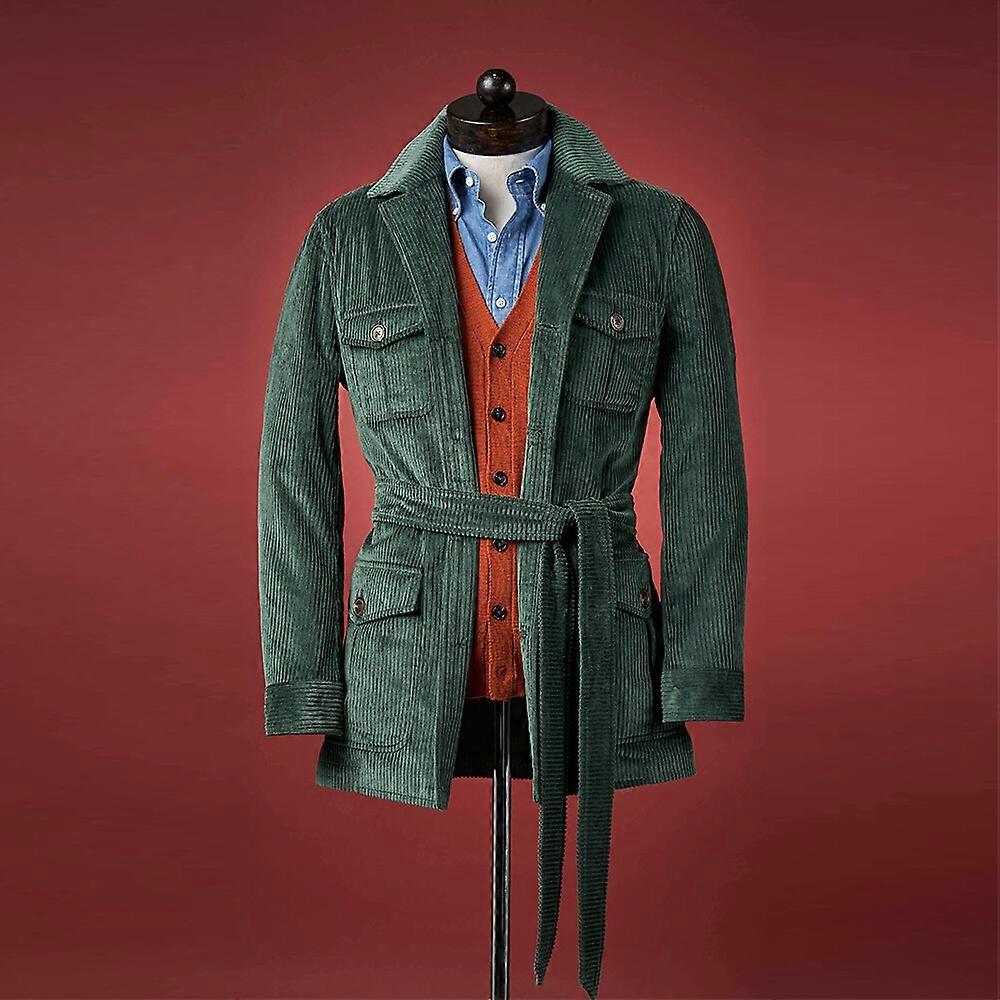 Vintage Corduroy Men's Safari Jacket Casual Wear Blazer with Belt Four Pockets
