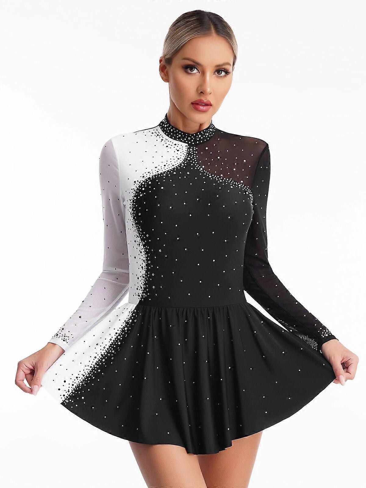 Women's Shiny Rhinestone Figure Skating Dress Sheer Mesh Ballet Dance Costume
