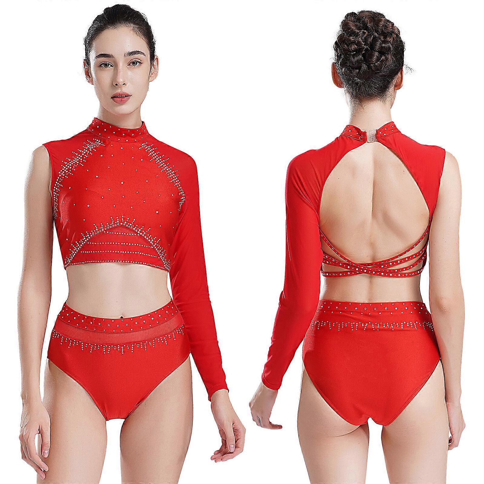 Womens Bodysuit Figure Skating Dancewear Solid Color Crop Top Gymnastics Shiny