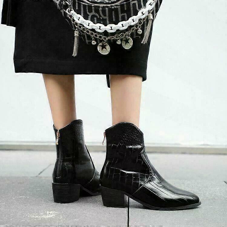 Crocodile Women's Patent Leather Ankle Boots Pointed Toe Block Heel Shoes Casual
