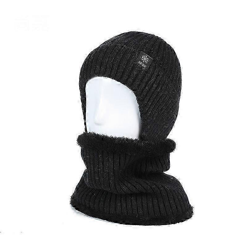 Men's winter warm knitted cap with ear flaps, thickened, cloche hat, sporty and simple style, black set