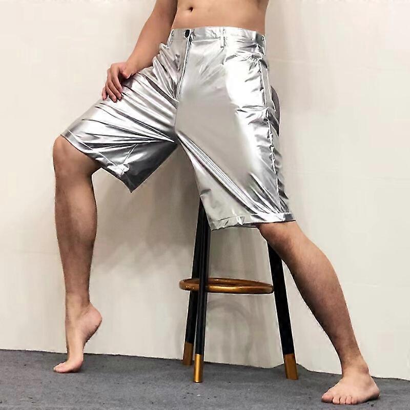 Men Faux Leather Loose Shorts Shiny Metallic Wet Look Half Pants Punk Bottom