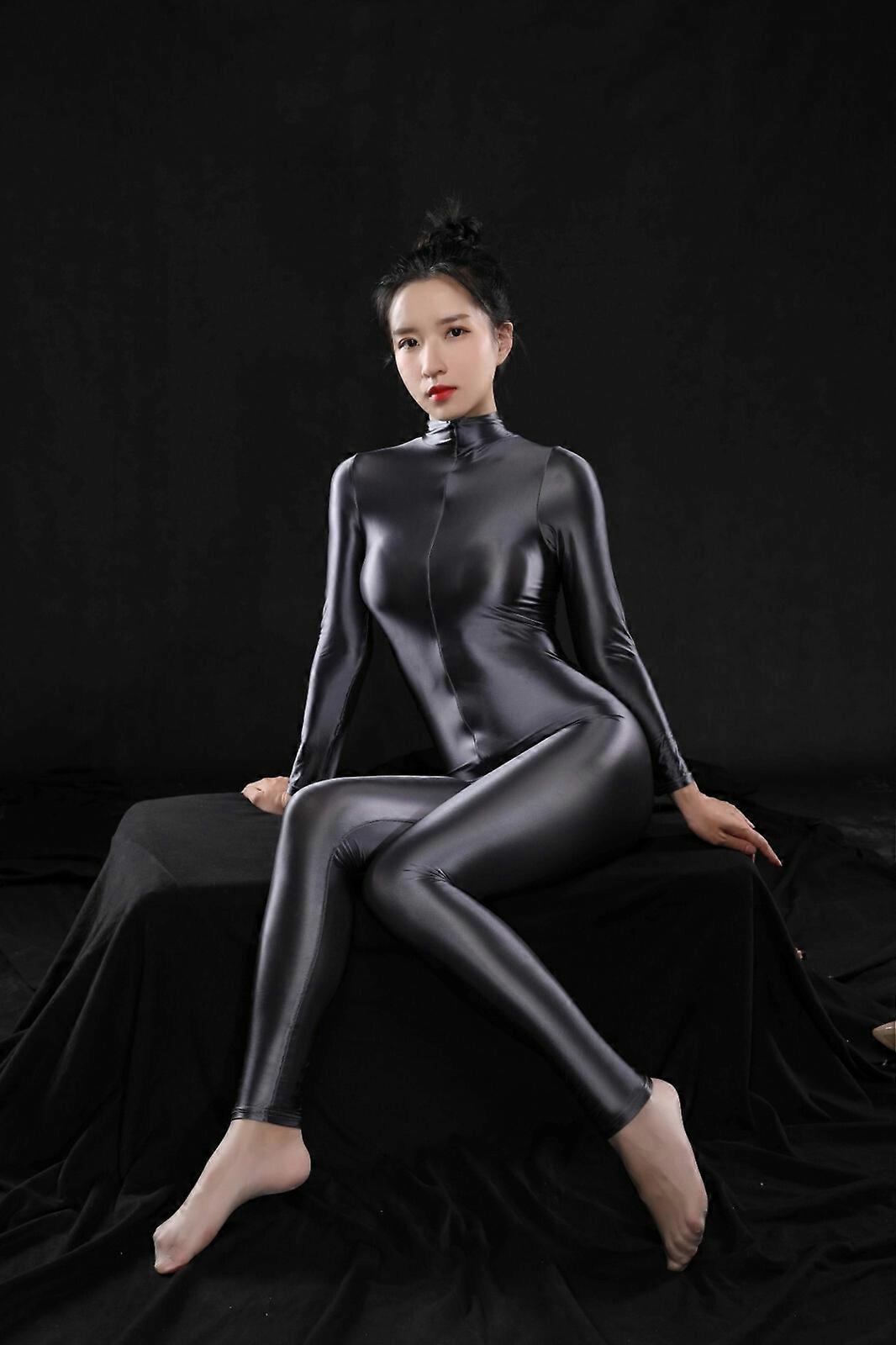 Women's Satin Shiny Catsuit Zip Up One Piece Unitard Jumpsuit Full Body Leotard