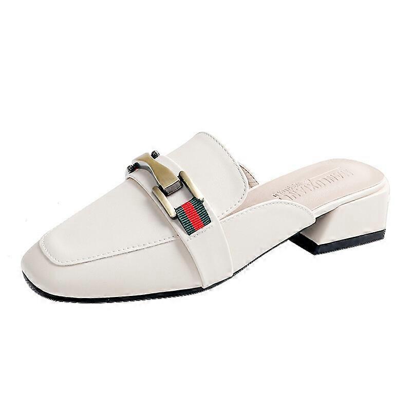 Chunky Heels Mules Metallic Chain Square Toe Black Flats Walking Women Shoes