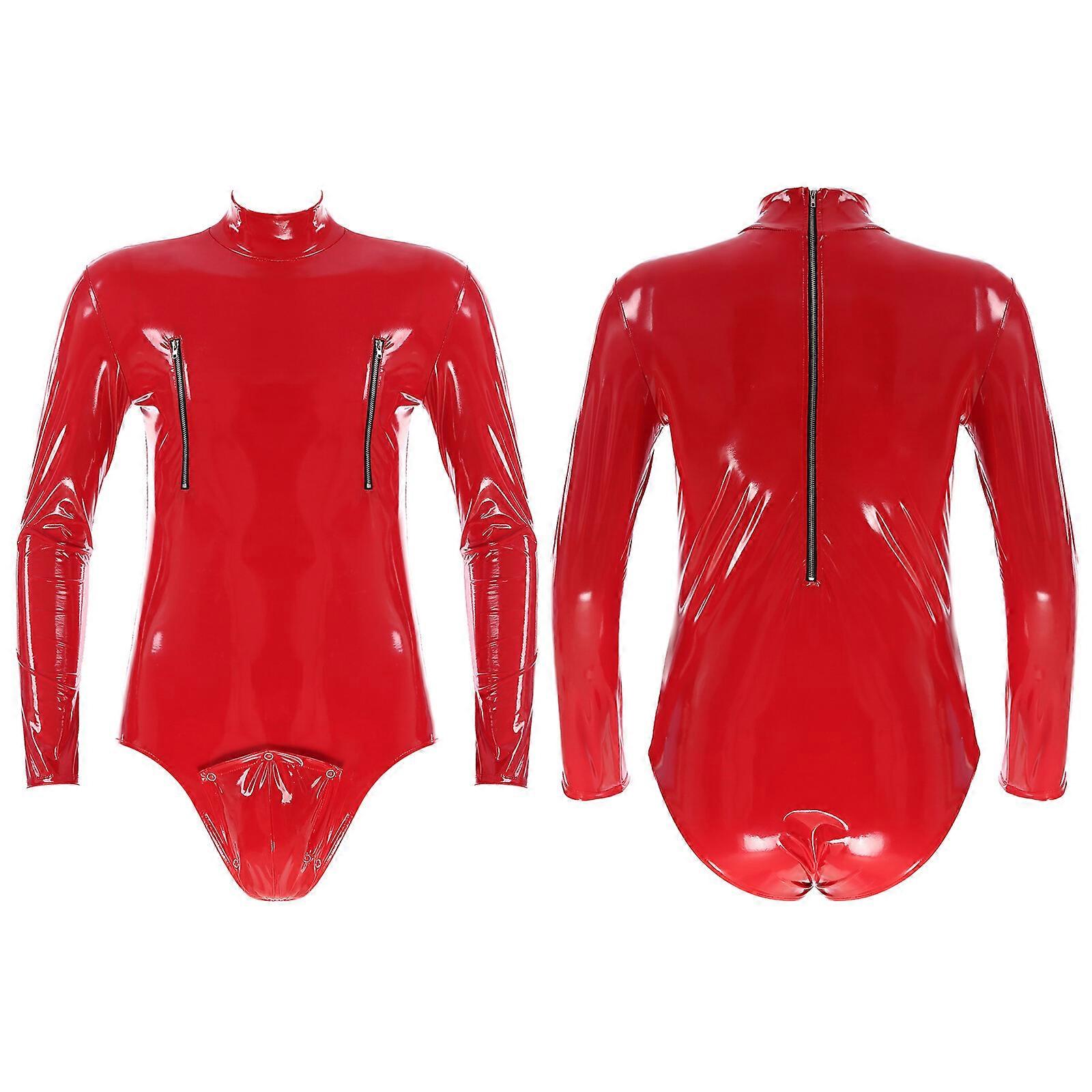 Men's PU Leather Long Sleeve Bodysuit Zipper Thong Underwear Jumpsuit Clubwear