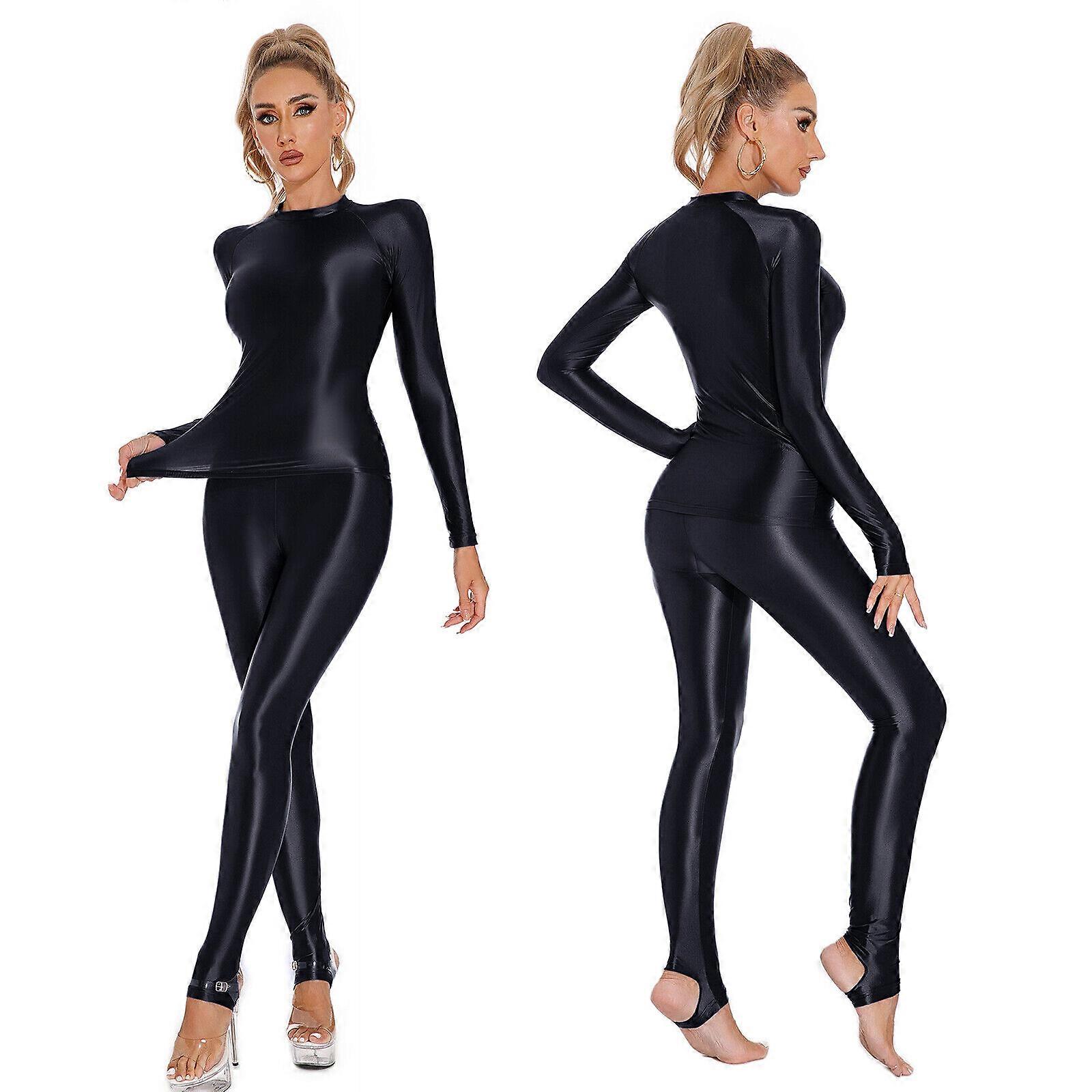 Womens Track Suits Casual Outfit 2pcs Set Glossy Leggings High Waist T-shirt