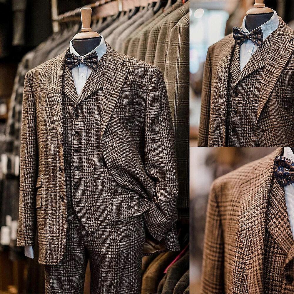British Plaid Men Suits 3 Pcs Groom Wear Blazer Tuxedo Business Casual Fit Slim