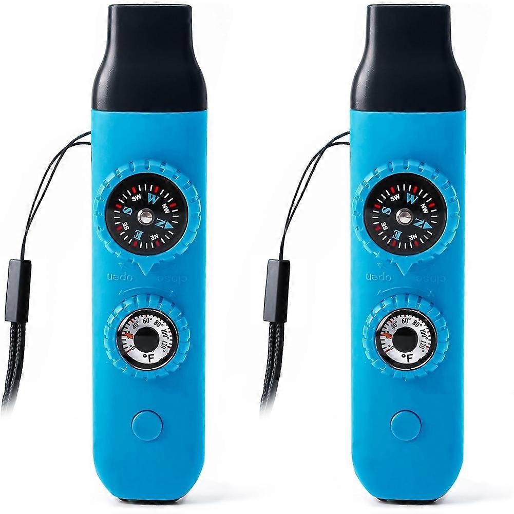 Its unique built-in mini storage compartment can be used to store important personal information so rescuers can know your situation immediately. (Note: If you need help in an emergency, try blowing the whistle softly; this will produce a louder sound than blowing it forcefully.) Anyone interested in adventure, hiking, or camping needs this 7-in-1 outdoor multi-functional safety whistle. It makes a perfect birthday gift for a man, husband, father, or Boy Scout friend, and is also ideal for preparing for the next Boy Scout march and improving outdoor skills. This emergency whistle is made of high-strength, shock-resistant, and heat-resistant ABS engineering material. It is lightweight and reliable, works in any condition, and features excellent airflow design. This survival whistle comes with a long enough lanyard to be attached to a backpack, belt, or neck. We offer multiple whistles that can be attached to keychains and lanyards for convenient use. The lanyard can easily pass through backpacks, sailboats, camping and hiking gear, life jackets, kayaks, personal flotation devices, paddleboards, and bicycles. You can also clip the whistle to your belt or shoulder strap for quick access in emergencies. This lanyard-equipped whistle is suitable for a variety of outdoor activities, such as cycling, skiing, camping, hiking, jogging, backpacking, archery, fishing, swimming, boating, kayaking, and water sports, ensuring your safety. It can also be used as a dog whistle. Color: Blue Material: ABS Package Contents: 2 * emergency survival safety whistles