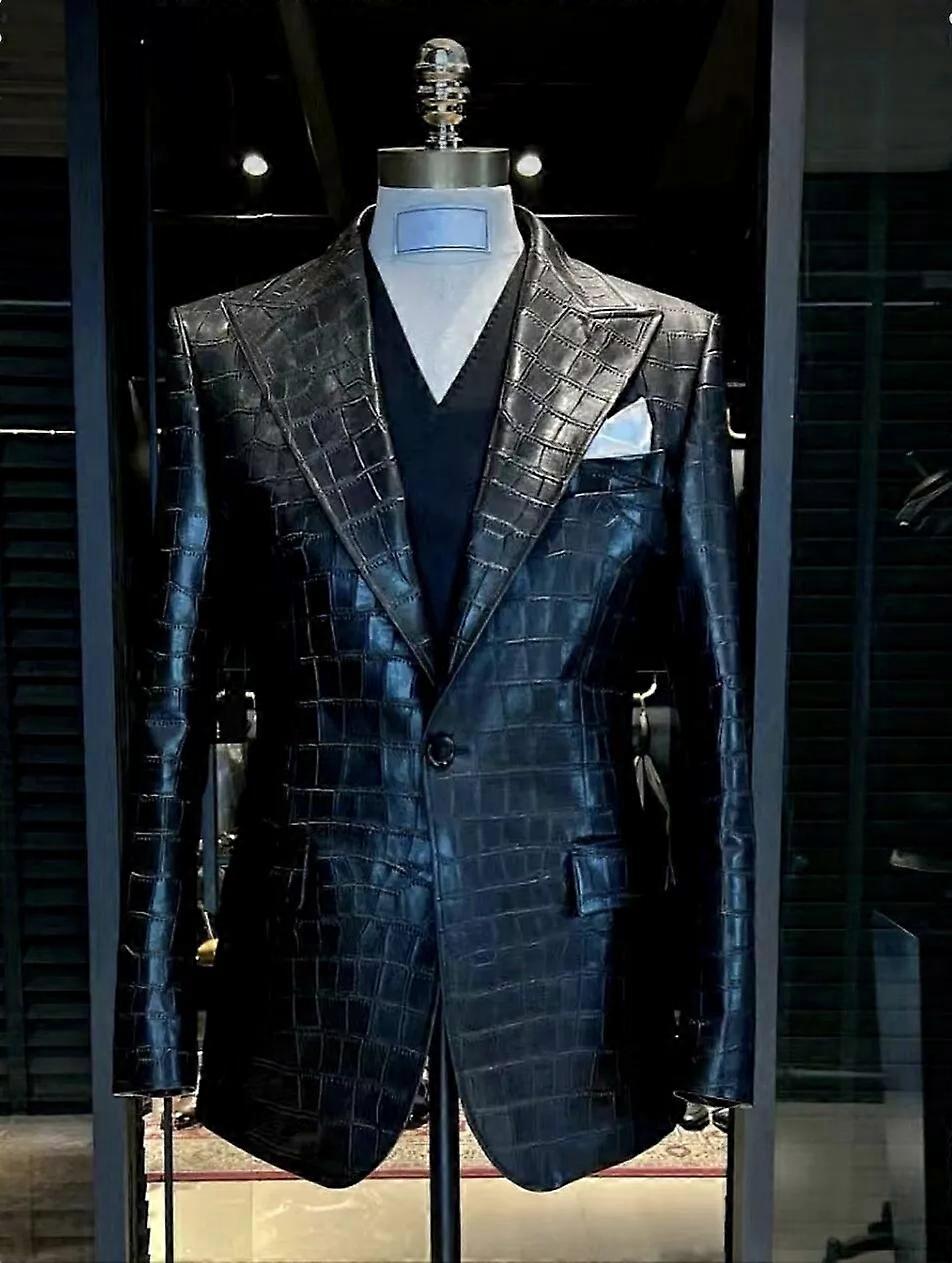 Fashion Faux Leather Men's Suits Wide Peak Lapel Dinner Host 2 Pcs Casual Blazer