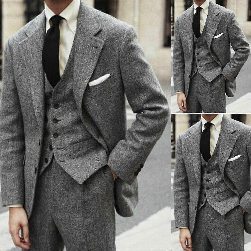 Gray Herringbone Men's Suits Wedding Groom Dinner Formal 3 Piece Tweed Tuxedos