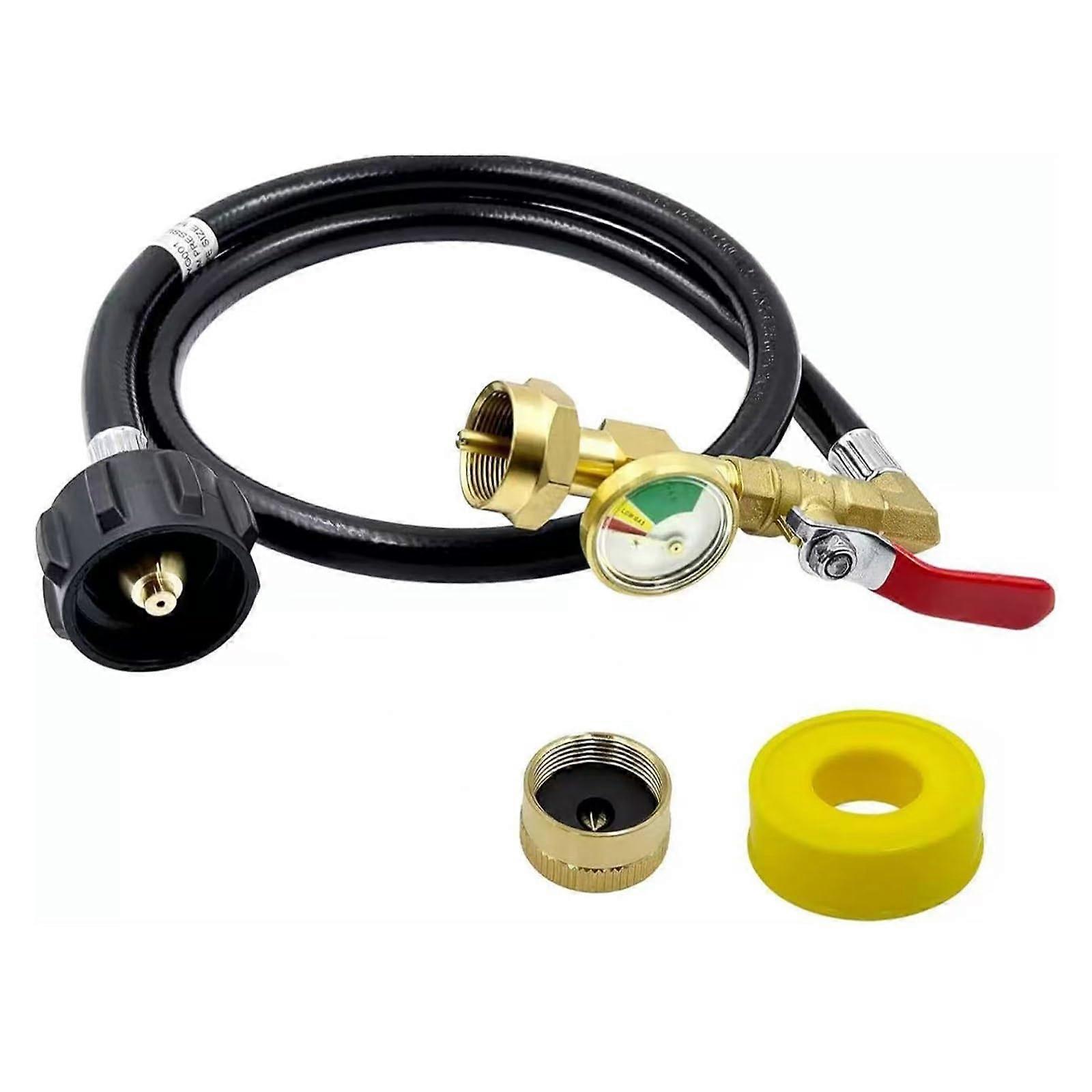 Builtin threecolor tank gauge for instant fuel checks Easyread dial shows green = full, yellow = low, red = empty. visibility design works in low light so you can check levels at a glance. Precise, leakresistant control Integrated 1/4' ONOFF control valve provides reliable shutoff and accurate fuel flow. Upgraded safety valve design helps ensure secure, leak connections. Spacesaving 90degree elbow Rightangle fitting reduces hose bending and strain. Compact profile fits tight spaces on grills, RVs, and refill stations. Durable, weatherresistant construction Made from solid brass for corrosion resistance and longterm outdoor use. Withstands temperature changes and regular outdoor exposure for consistent performance. Tool, fast refilling Connect to a 5–40 LB propane tank, attach a 1 LB bottle, invert the system, and transfer fuel within seconds. No tools or technical skills required—quick setup for busy outdoor situations. Compatibility and specifications Designed for use between 5–40 LB refillable propane tanks and 1 LB refillable bottles. Key components: builtin threecolor gauge, 1/4' ONOFF control valve, 90degree elbow, solid brass body. Practical use scenarios Backyard BBQ: Quickly up 1 LB bottles from a full 20 LB tank during a cookout without interrupting service. Camping and tailgating: Refill small 1 LB bottles for stoves or portable grills when campsite supplies are limited. RV and outdoor heating: Maintain small portable heaters and tabletop appliances by transferring fuel from larger tanks in tight hookup areas. Why choose this adapter Eliminates guesswork with a clear fuellevel indicator. Reduces hose stress and saves space thanks to the 90degree design. Built to last outdoors with solid brass and reliable valve control. Fast, tool operation makes refilling practical and repeatable. What you get A solidbrass refill adapter with integrated gauge and 1/4' ONOFF valve, ready for immediate use with compatible propane tanks and 1 LB bottles.