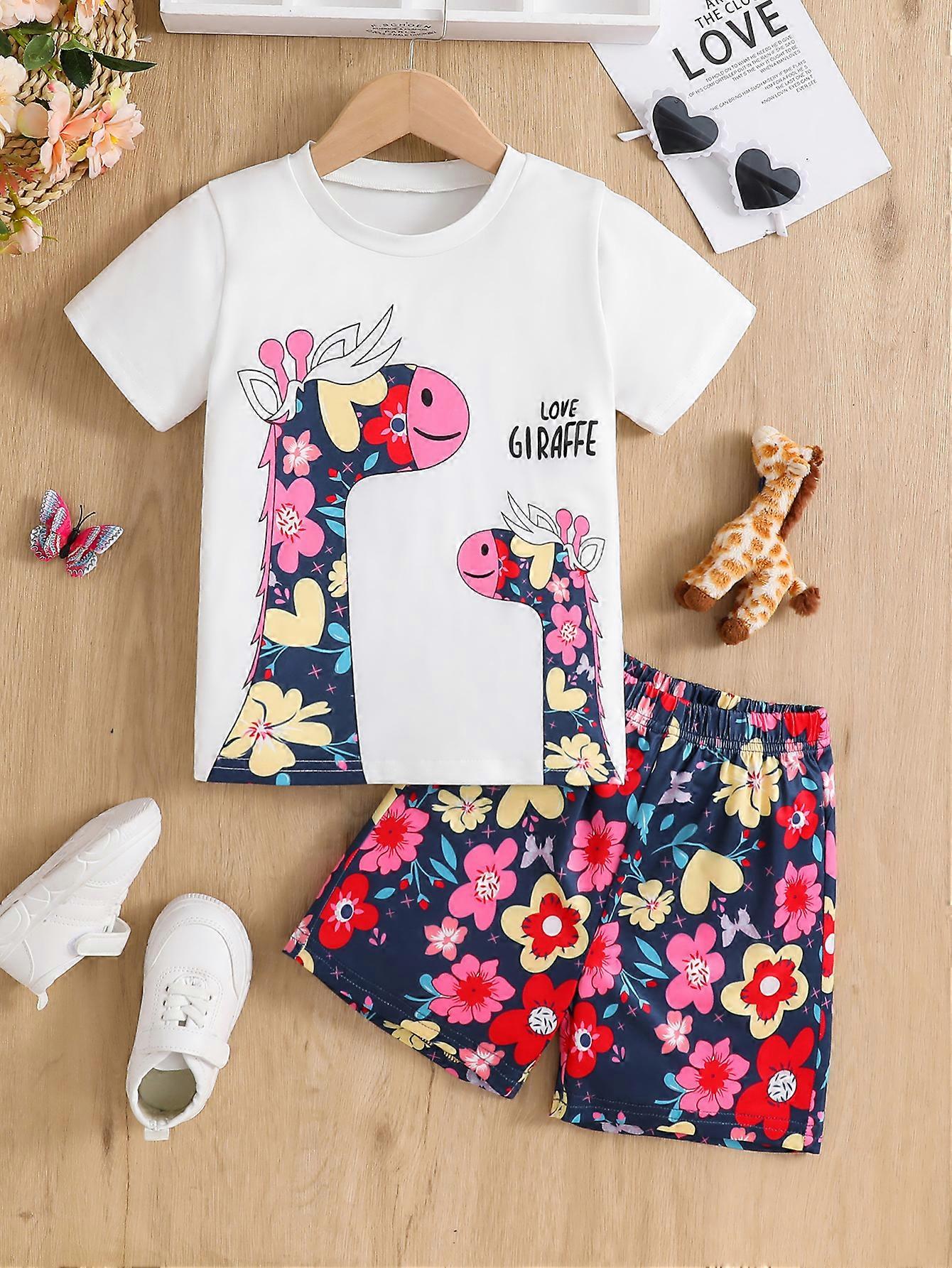 Best-Selling Sweet and Cute Girl's Summer Sika Deer Print Short-Sleeved Shorts Suit with Letters, Gentle and Fresh Style