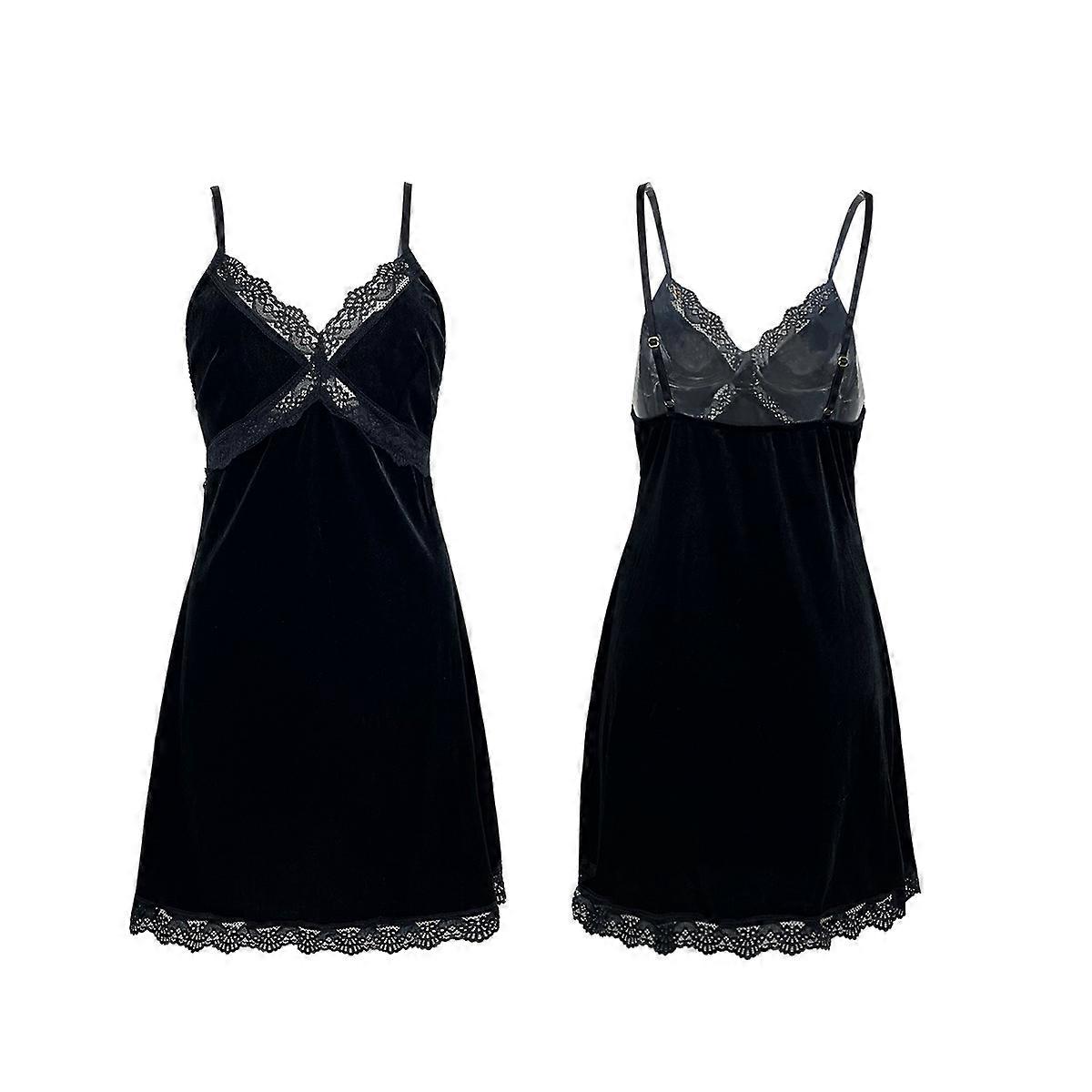 Women's Velvet Nightdress Sexy Deep V Nightgown Female Lace Patchwork Suspender Skirt Backless Adjustable shoulder strap Dress