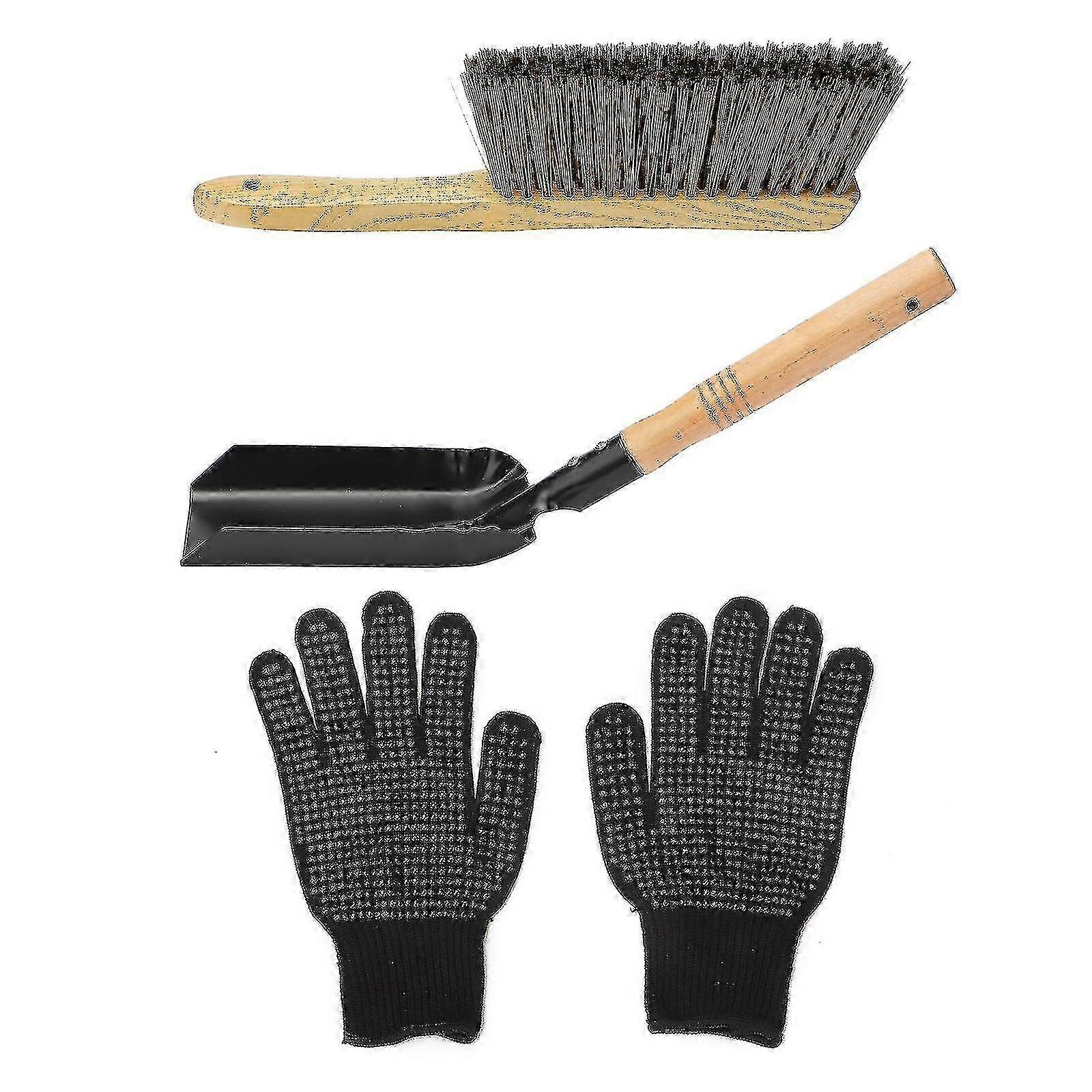 Fireplace cleaning tool kit, silicone gloves, hearth brush set, lightweight wooden handle, sturdy and durable coal shovel