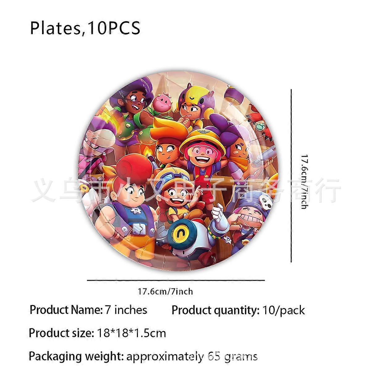 Cartoon Brawl Stars themed party decorations: disposable paper plates, paper cups, and tissues.