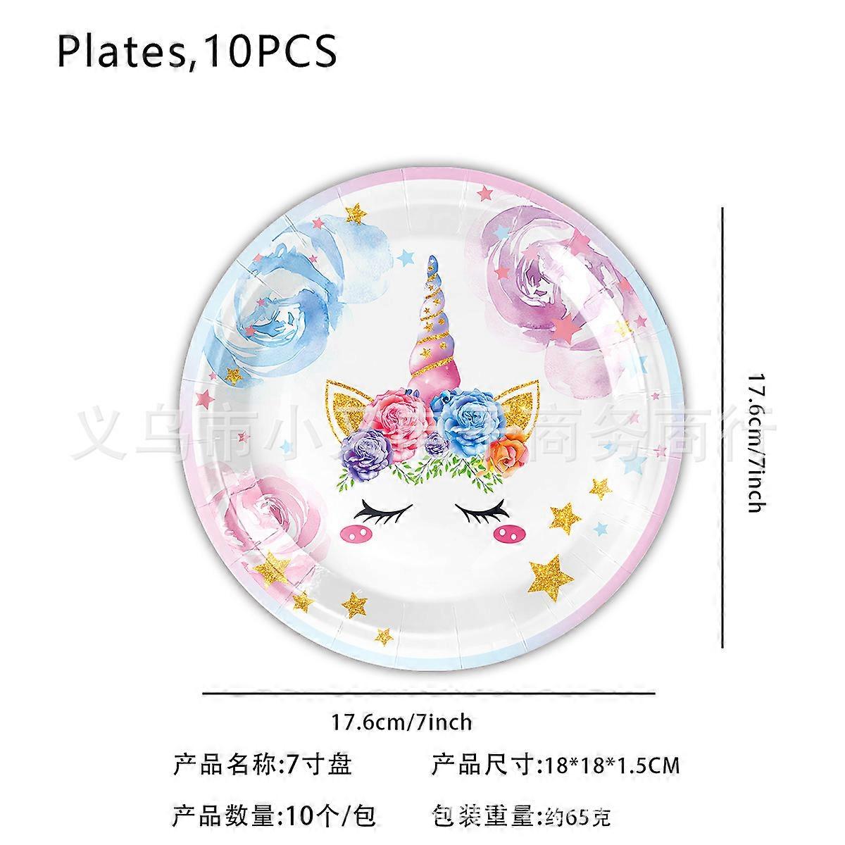 Pattern: Unicorn<br>Product Color: Unicorn<br>Color: 7-inch plate 10PCS, 9-inch plate 10PCS, paper cup 10PCS, paper napkins 20PCS, paper straws 10PCS, knife 10PCS, fork 10PCS, spoon 10PCS, tablecloth 1PCS, banner 15P<br>Thickness: 0.1mm<br>Patent: No<br>Quantity: 10<br>Material: Paper<br>Product Number: Unicorn<br>Target Audience: Children<br>Customization: No<br>Export Only: Yes<br>Carton Quantity: 250<br> Category: Disposable Tray<br>Gross Weight: 70g<br>Shape: Round<br>Origin: Zhejiang Province<br>Brand: Other<br>Item Number: Unicorn<br>Shelf Life: 3 months<br>Logo Printing: No<br>Main Downstream Platforms: Independent Websites, Lazada, Others<br>Own Brand Available for Authorization: No<br>Biodegradable: Biodegradable<br>Size: 18cm<br>Copyright: None<br>Imported: No<br>Main Sales Regions: Southeast Asia, North America, Northeast Asia, Middle East, Others<br>Style: Cartoon<br>Capacity: 250ml