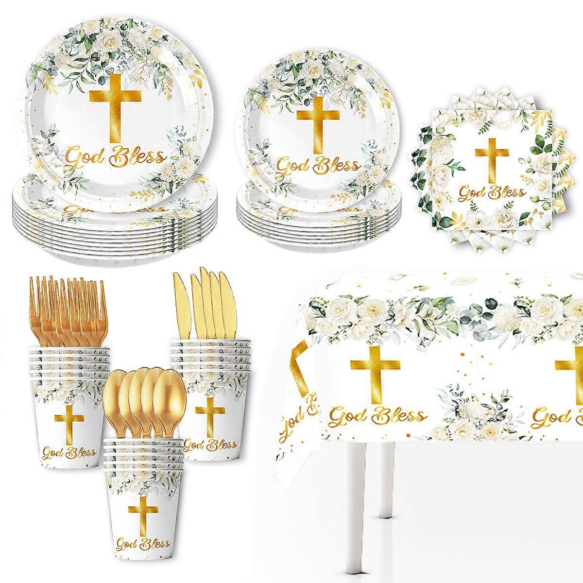 Baby Communion Baptism Party Dinnerware Decoration Set, White Floral Cross Paper Plates, Tablecloth