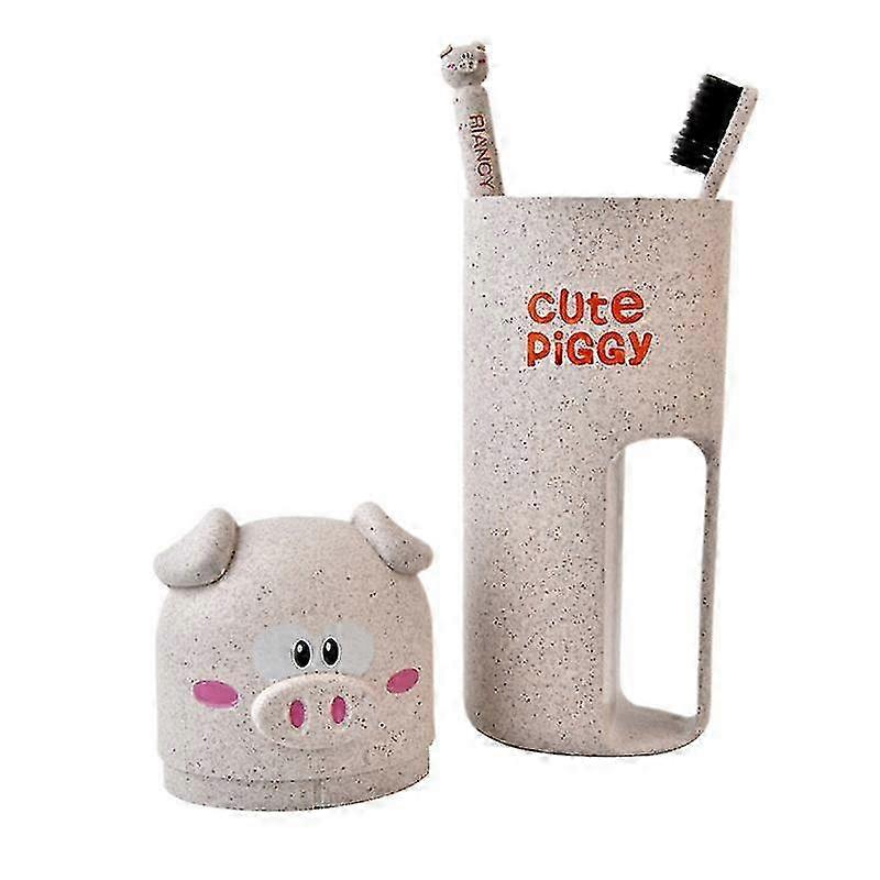 Pig-shaped toothbrush cup, portable toothbrush cup with two toothbrushes, beige.