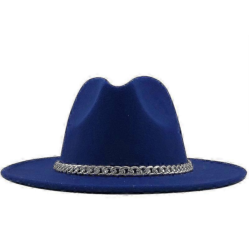High-quality wide-brimmed felt hat, unisex, faux wool felt hat, metal chain decoration, Panama felt hat, wide-brimmed hat, blue, 56-58CM