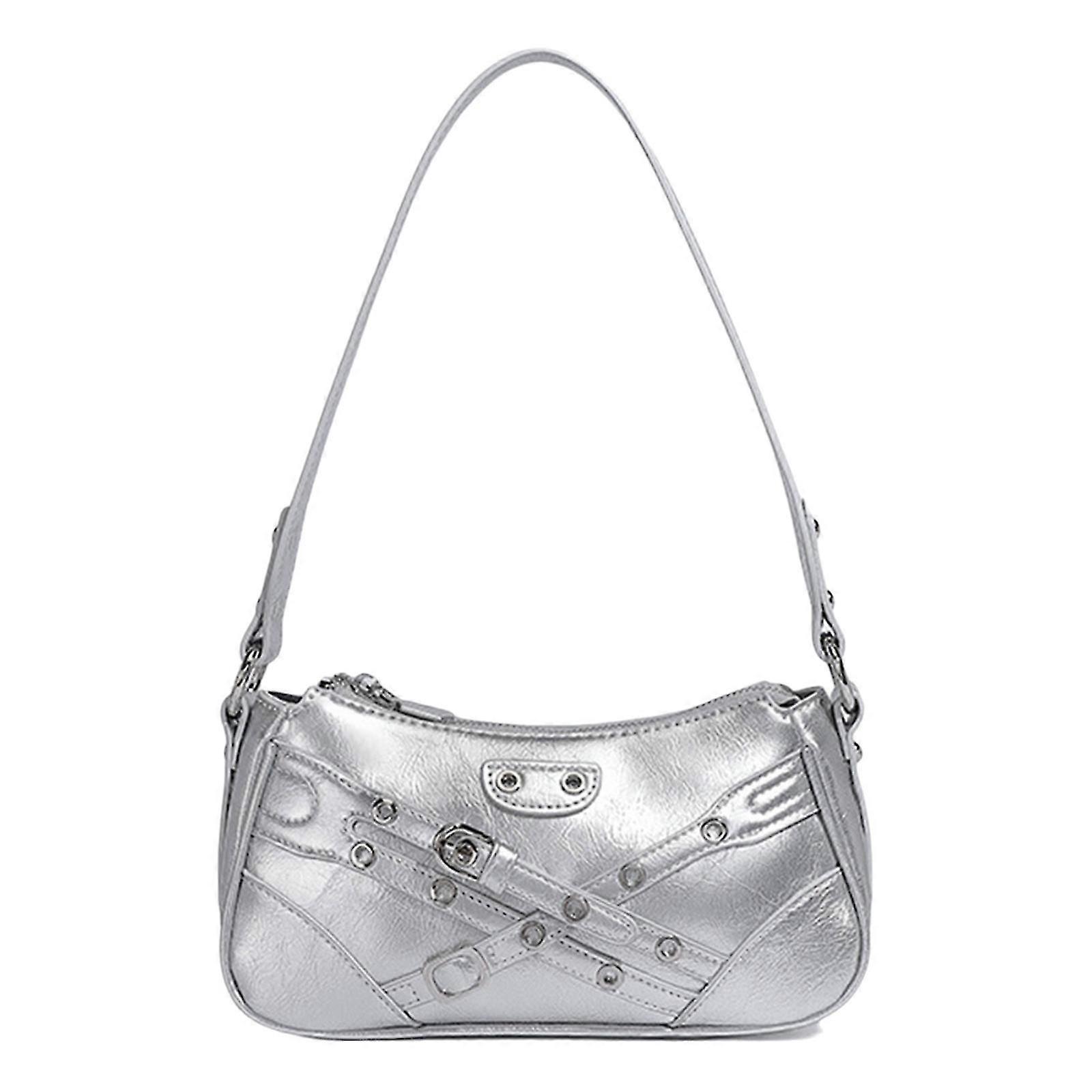 Women Aesthetic Handbag All-Matching Underarm Bag PU Leather Shoulder Bag Shopping Bag Autumn Winter Armpit Bag for Work Silver