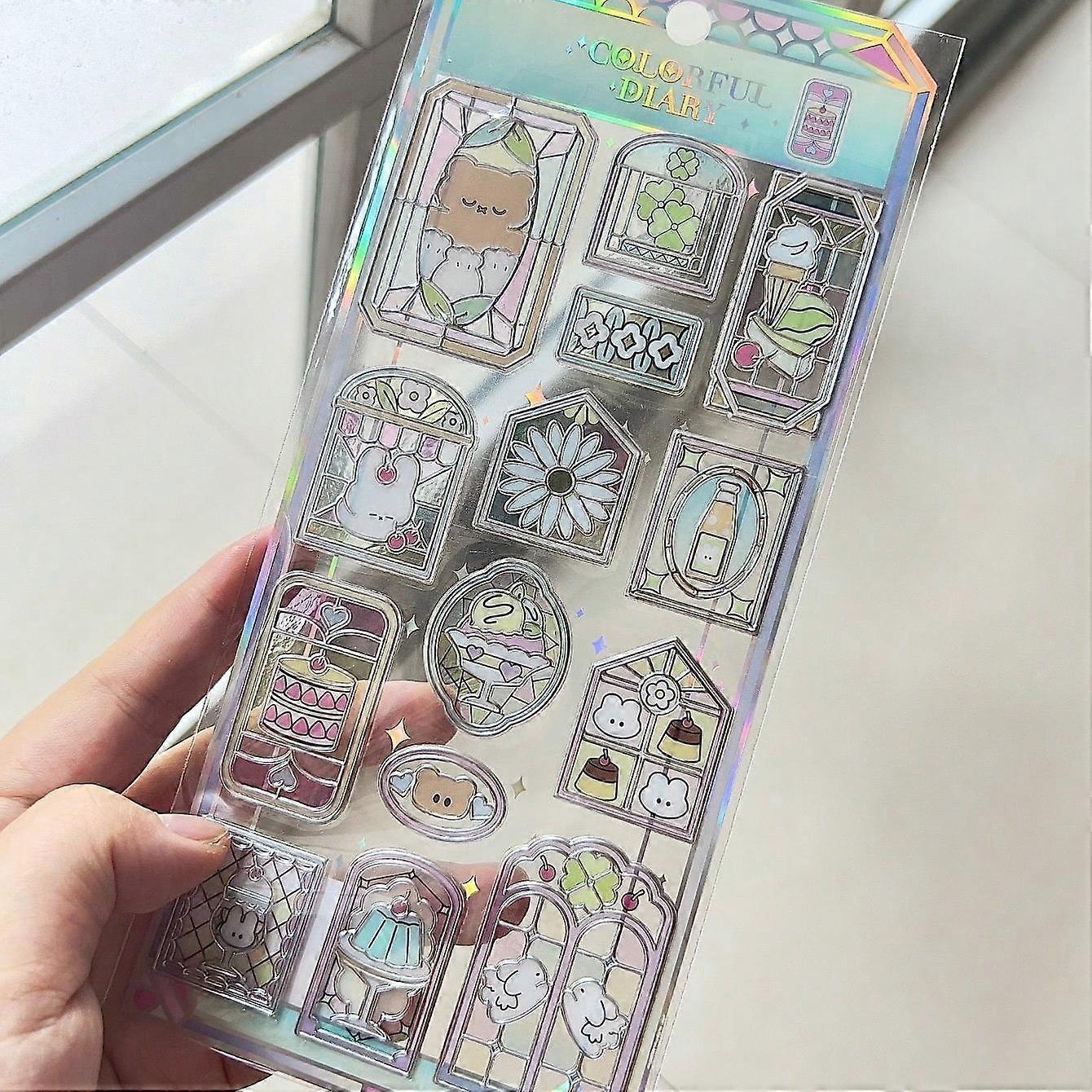 12�C14pcs 3D Holographic Glass Window Stickers, Cute Cartoon Diary & Scrapbooking Laser Decorative Stickers for Notebooks