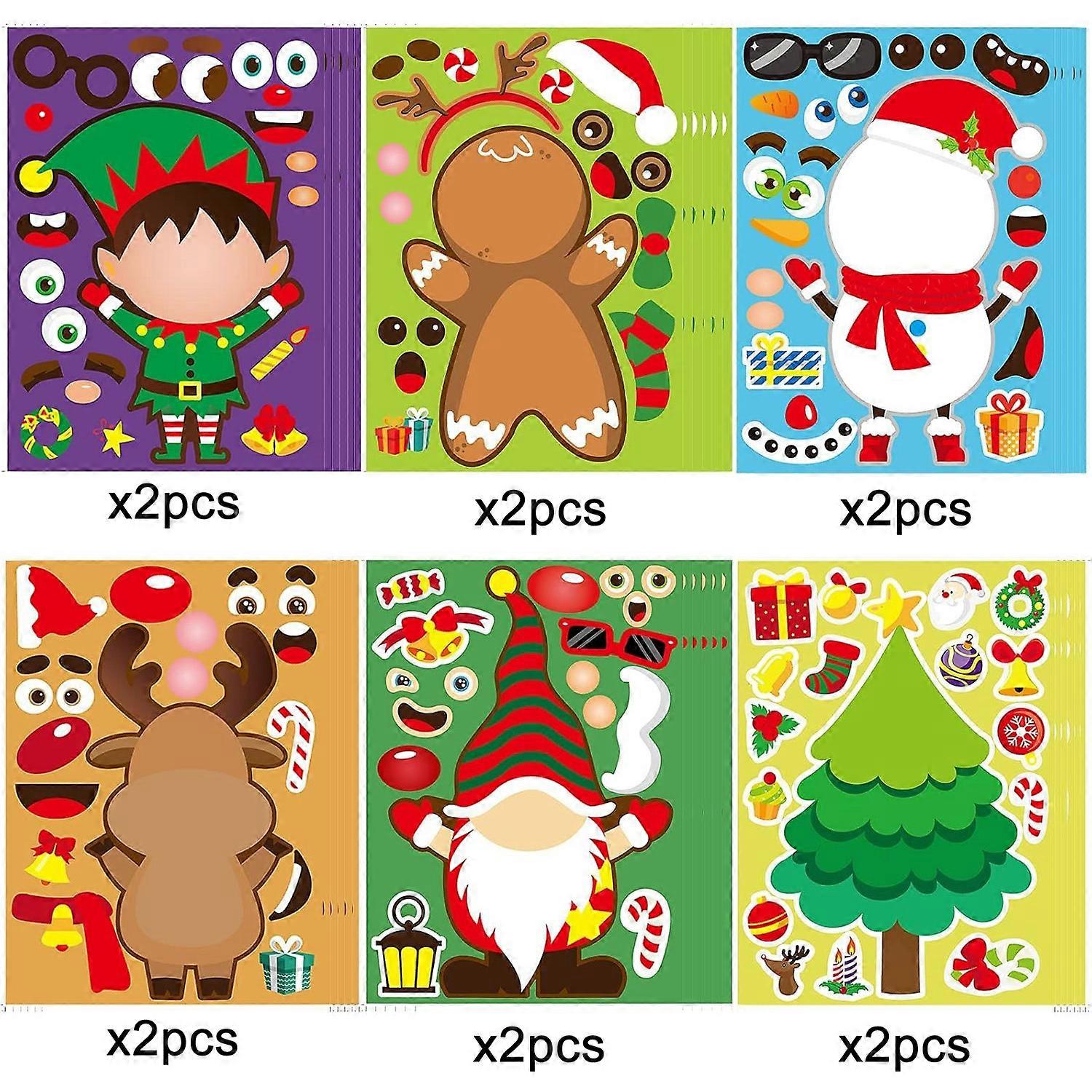 12PCs Christmas Stickers for Kids DIY Cartoon Character Stickers Make a Face Game for Xmas Crafts Activities Holiday Party gifts