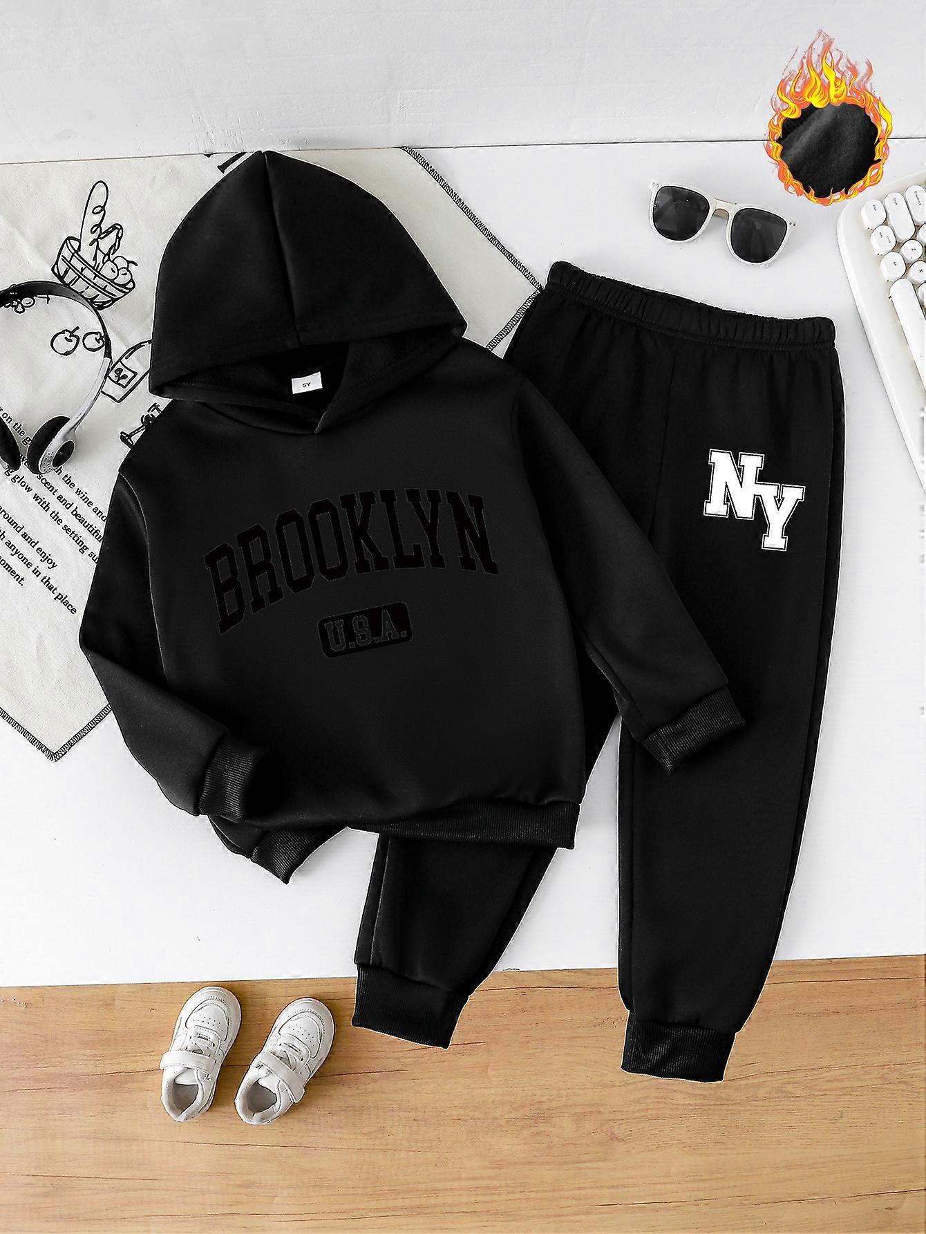Boys Fashion Autumn and Winter Letters American Retro BROOKLYN All-match Printed Fleece Warm Sweater Hooded Pullover Casual blac