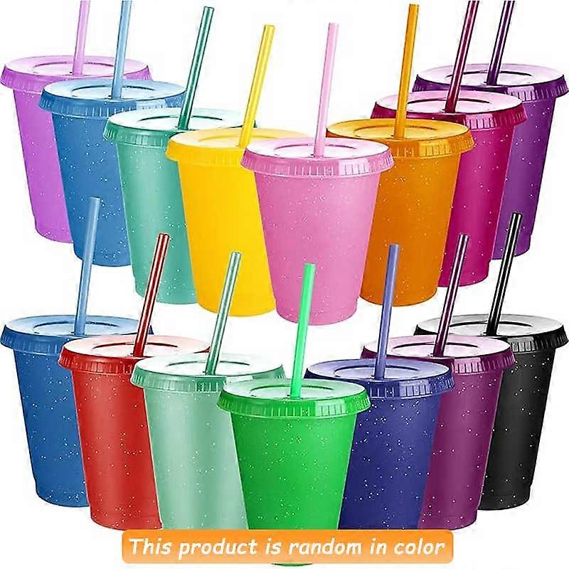 Glitter Reusable Plastic Cup with Straws and Lids Water Bottle Iced Coffee Mug for Birthday Party 16oz(Randomly assorted colors)
