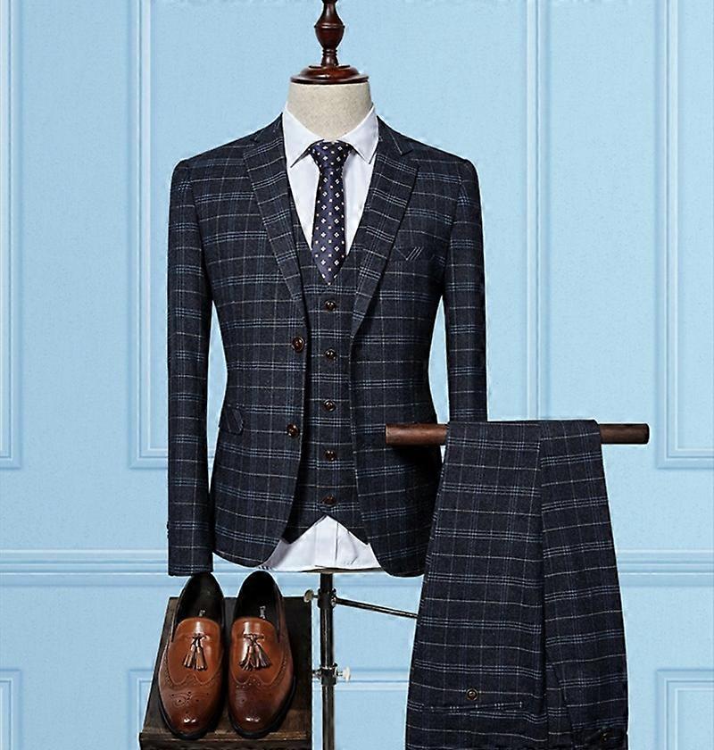 Mens Slim Fit Two Button 3Pcs Suits Plaids Check Groom Wedding Dress Formal Suit