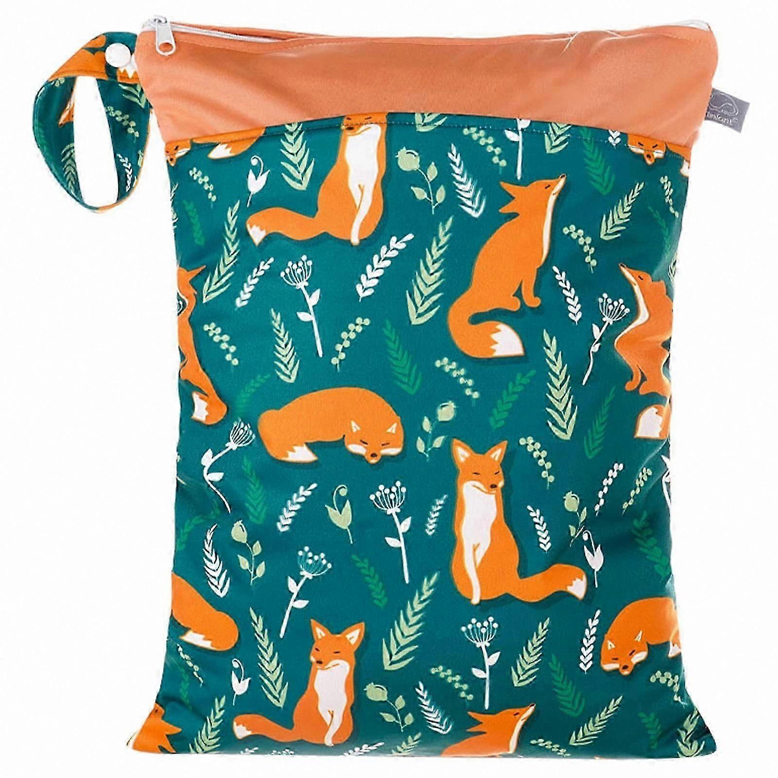 Large Waterproof Wet Bag Set - Green Fox & Small Animal Print Cloth Nappy Bags for Nursery On the Go Washable Reusable Diaper Storage Solution