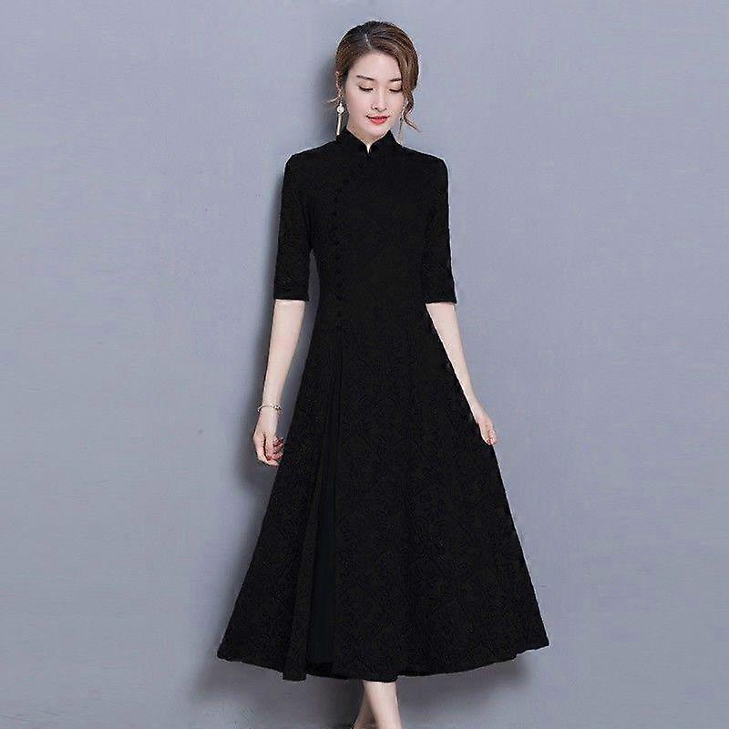 Lady Lace Floral Collar Ethnic Mandarin Chinese Half Sleeve Long Dress Qipao Hot